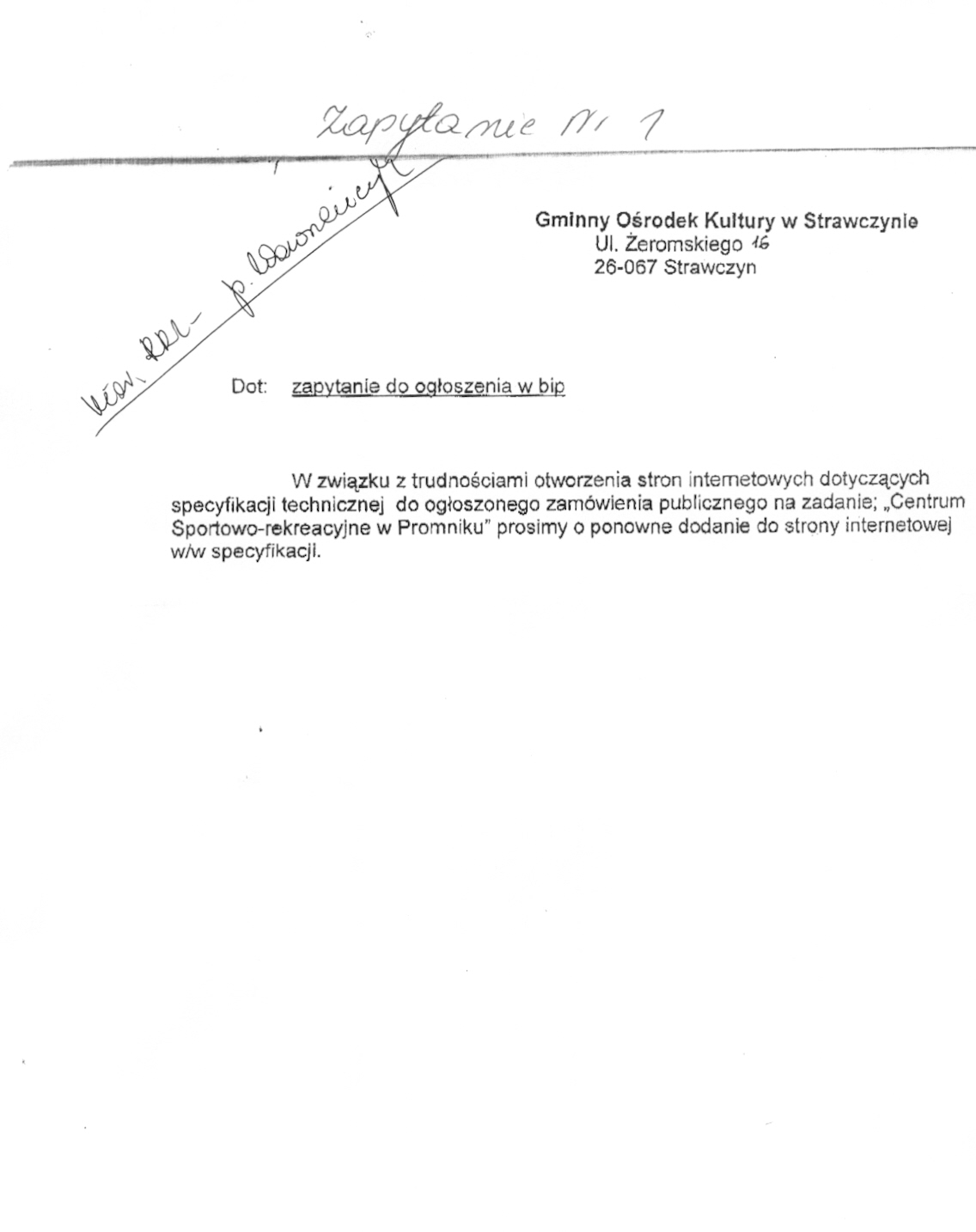 I. 1) NAZWA I ADRES: Gminny Ośrodek Kultury w Strawczynie , ul. Żeromskiego 16, 26-067 Strawczyn, woj. świętokrzyskie, tel. 0-41 3038635, 3038002 w. 35.
