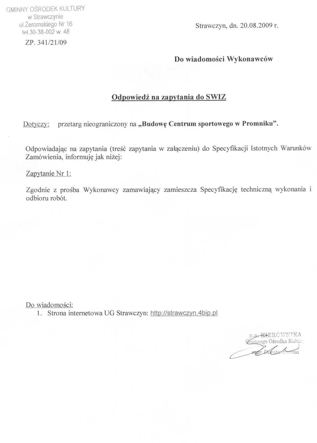 IV.3.4) Termin składania wniosków o dopuszczenie do udziału w postępowaniu lub ofert: 26.08.2009 godzina 14:00, miejsce: Urząd Gminy w Strawczynie ul. Żeromskiego 16 26-067 Strawczyn I piętro, sekretariat.